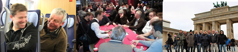 Ende November war es endlich soweit! Die erste Mannschaftsfahrt der Pocket Rockets aus Verl stand auf dem Programm. Ursprünglich sollte das Ziel unserer Reise das Kings Casino in Rozvadov (Tschechien) sein. Da aber genau an dem von uns ausgewählten Wochenende ein größeres Turnier im Kings Casino stattfand, entschied man sich seitens der Mitglieder kurzfristig um und wir wählten Berlin als den Ort aus, an dem wir uns erstmals mit Pokerspielern außerhalb unseres Vereins messen wollten. Samstag, den 21.11., ging es also mit 15 Personen - Ralf musste aus familiären Gründen kurzfristig absagen - früh morgens mit dem Zug los. Über die Reiseagentur Fröse aus Rheda konnte man ein überaus faires Gruppenangebot für Bahnfahrt & Hotel organisieren. Bereits vor Mittag dann die Ankunft am Berliner Hauptbahnhof und von hier aus ging es direkt in das nur einige Gehminuten entfernte AMANO Grand Central Hotel. Mit dem Management des Hotels konnte man im Vorfeld vereinbaren, dass wir den geräumigen Frühstücksraum für ein Warm-Up-Pokerturnier nutzen durften. Bei diesem Turnier siegte übrigens der Hauptorganisator der Reise, Jens Clausen, vor Jens Weyland und Salvatore Messina. ![]() Nachdem sich dann die meisten auf den Zimmern noch ein wenig erholten (oder sich aber auf andere Weise für den Hauptbestandteil der Reise - die Abendturniere in den Spielbanken - vorbereiteten), machten wir uns am frühen Abend zusammen auf um zu den verschiedenen Locations zu gelangen. Wir hatten uns nämlich im Vorfeld der Reise darauf geeinigt, dass wir uns aufgrund der Vielzahl an Personen (16) für unterschiedliche Events registrieren wollten, um uns nicht gegenseitig der Siegchancen zu berauben. So teilten wir uns auf die drei Spielbanken Berlins auf. Florian, Salvatore, Dirk und Ömer spielten in der Spielbank am Fernsehturm. Jens C., Carsten, Hirschi, Richie und Potti wählten die Spielbank am Potsdamer Platz. Und der Rest und die somit größte Fraktion (Thilo, Alex, Sven, Ulf, Jens W., Tobias und Lars) entschied sich für die Location in der Hasenheide in Berlin-Neukölln. Wobei es für unseren ersten Vorsitzenden Thilo an der Hasenheide leider sehr unglücklich lief. Er hatte seinen Ausweis vergessen und der Einlass ins Casino wurde ihm verwehrt. Per eingerichteter Whatsapp Gruppe hielt man sich über die Zwischenstände der Anderen auf dem Laufenden. Und schnell war auch klar, dass man in Deutschlands Hauptstadt nicht nur gut mitspielen konnte, sondern dass die Pocket Rockets das Spielgeschehen quasi überall dominierten! Sowohl am Potsdamer Platz (Richie) als auch an der Hasenheide (Lars) stellte man nach einigen Stunden Spielzeit den souveränen Chipleader. Aber beim Pokern kommt es erstens anders und zweitens als man denkt! Einige unglückliche Konstellationen brachten Lars an der Hasenheide nicht nur um den möglichen Sieg, sondern sogar zudem noch um das Erreichen der Preisgeldstufen. Dies gelang dafür Sven, der mit einem 7. Platz somit den ersten Cash unserer Gruppe einfuhr. In der Spielbank am Fernsehturm lief jedoch nicht ganz viel zusammen und alle Pocket Rockets mussten sich bereits überraschend früh aus dem Turnier verabschieden. Konnten es die Jungs am Potsdamer Platz besser machen und die Kohlen aus dem Feuer holen? Ja, sie konnten, obwohl es auch dort für einige alles andere als optimal verlief. Potti (trotz eines Rebuys!) sowie Hirschi schieden bereits unerwartet früh aus. Auch Carsten und Jens erwischte es noch vor dem Erreichen der Preisgelder. Richie hingegen hielt die Farben des Vereins nicht nur aufrecht, sondern konnte nach über 7 Stunden auch den letzten Konkurrenten eliminieren. Für Richie - in der Szene und den Insidern eigentlich nur unter Richy182 bekannt - gab es somit nicht nur den Turniersieg, sondern auch süße 1.100€ on Top! In der Skyscraper Bar des Amano Hotels stieß man zu nächtlicher Stunde noch gemeinsam auf die Erfolge von Richie und Sven an, bevor sich ein langer, anstrengender und sehr schöner sowie letztendlich auch erfolgreicher Tag dem Ende neigte. Nach einem gemeinsamen Frühstück ging es für den Großteil der Gruppe kurz vor Mittag auf zu einem langen zweistündigen Spaziergang quer durch Berlin. Ziel war die Mercedes-Benz-Arena (früher O²), wo man am frühen Nachmittag Karten für das Eishockeyspiel der Berliner Eisbären gegen die Hamburger Freezers organisiert hatte. Da das Spiel nicht nur etwas später als vorhergesehen begann, sondern auch noch unverhältnismäßig oft unterbrochen wurde, mussten wir uns leider bereits vor Ende der Spielzeit auf den Weg machen um rechtzeitig zurück zum Hauptbahnhof zu gelangen. Das Spiel endete übrigens 3:2 für die Freezers nach Penalty shooutout. Am frühen Abend ging es dann erschöpft mit der Deutschen Bahn zurück Richtung Heimat. Und alle waren sich einig: Dies war nicht die letzte Mannschaftsfahrt und beim nächsten Mal werden die Pocket Rockets mal richtig ernst machen. Da kann kommen wer will! :-) :-) Die komplette Bildergalerie findet hier hier! Bericht Martin Pott |