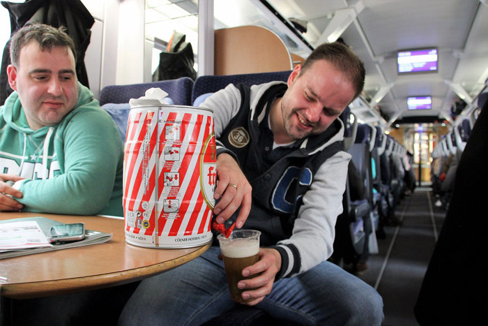 Während der Eine im ICE die Auge zu machte, war der Andere mit den Tücken der Moderne beschäftigt....." vom Bierfass kommt kein Bier raus", du muss die Lasche ziehen, sagt der eine.....Sche...ß, der Druck ist zu stark.......wer hat Taschentücher!?!? und so Weiter bis nach Berlin!