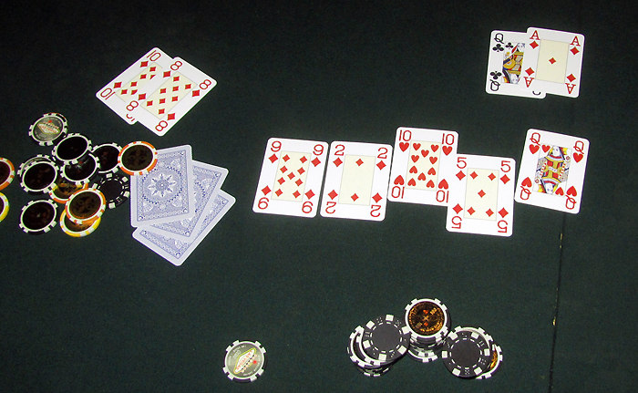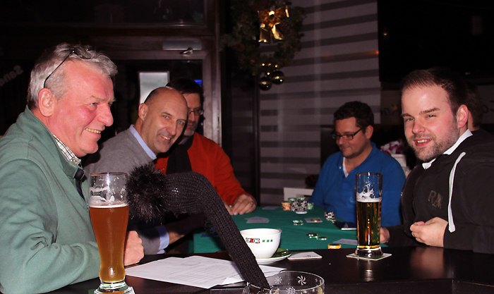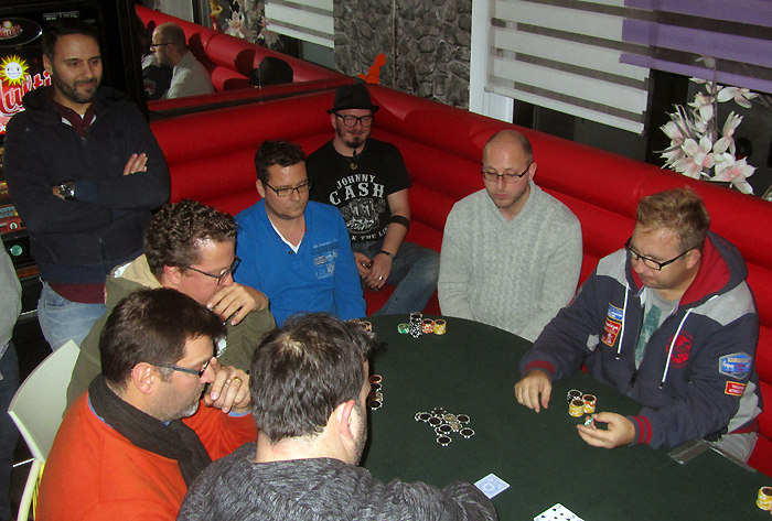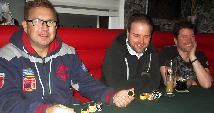 Gestartet wurde pünktlich um 16:00 Uhr mit der ersten Vorrunde und die Titelverteidiger Ostwestfalen Camorra standen von Beginn an unter einem besonderen Druck. Stunden vor dem Event kam eine Ansage, die nun durch eine Titelverteidigung untermauert werden musste. Der selbsternannte „klare Favorit“ auf den Titel floppte dann in einer der Vorrunden auch sofort Quads Aces und fühlte sich bestätigt, dass dies ihr Abend werden sollte. Die Vorrunden verliefen insgesamt sehr ausgeglichen. Kleiner Ausreißer nach oben war Ole, der als einziger Teilnehmer mehr als 10.000 Chips für sein Team erspielen konnte. Das Team der Chip Hunter konnte sich mit dieser Hilfe über Platz 1 nach zwei gespielten Vorrunden erfreuen. Den Ausreißer nach unten verbuchte das Traditionsteam The Aces of Spades, denn Thilo musste in beiden Vorrunden jeweils die Flügel als erster strecken… ![]() In der folgenden Dinnerbreak wurden dann die Chips gezählt und die Platzfolge für den Final Table ermittelt. Da zwei Teams dieselbe Anzahl an Chips erspielten, mussten die Positionen 8 und 9 per Losentscheid ermittelt werden. Die Ostwestfalen Camorra zogen dabei den Kürzeren und ihnen wurde die „Ehre“ des Kartendealers zuteil… Das Team der Stukas ging mit den wenigsten Chips aus den Vorrunden an den Start und musste das Feld nun von ganz hinten aufrollen. Zur Stärkung wurde vor dem Final Table leckeres Gulasch mit Nudeln sowie ein Schnitzelbuffet bereitgestellt. Lecker Essen, wie immer!!! ![]() Da wir am Final Table wieder mit einer kleinen Blindstufe beginnen, gab es auch bei dieser Auflage genug Spielraum für die verschiedensten Taktiken. In den ersten 3 Blindstufen kamen nach und nach alle Chips ins Spiel und die Teams konnten ihre direkten Kontrahenten beschnuppern. Richtig Fahrt wurde dann im vierten Level aufgenommen. Salvatore saß aktuell für den Titelverteidiger am Tisch, als es zu der folgenden Hand kam. Salvatore eröffnete aus mittlerer Position und bekam einen Call aus den Blinds. Auf einem Board 10 9 2 mit 2 Karo’s wurde seine Contibet mit einem Checkraise beantwortet. Da Salvatores Team nicht mit sehr vielen Chips unterwegs war, wollte er die Hand nicht alleine weiterspielen und zog seinen Joker für eine kurze Unterbrechung. Jedes Team hat am Final Table zweimal die Möglichkeit, sich zu einer kurzen Beratung zurückzuziehen. Zurück aus der Beratung kam dann ein schnelles All-In und ein Call des gegnerischen Teams. Beim Aufdecken der Karten dann der Schock für Salvatores Beratungskollegen Potti. Salvatore dreht AQ mit einem Karo um und ist gegen Top Pair mit Flushdraw klarer Außenseiter. Potti war von 2 Overcards inklusive Flushdraw ausgegangen. Offensichtlich gab es ein kleines Kommunikationsproblem im Hintergrund… Ein Karo am Turn, aber kein Weiteres am River ließ alle Träume auf eine Titelverteidigung platzen. Platz 10! ![]() Für die Chip Hunter lief der Final Table zuerst auch nicht nach Plan. Nach der erfolgreichen Vorrunde wollte lange nichts klappen und der Chipstapel schrumpfte gewaltig. In Level 7 gingen nach einem Openraise alle Chips in die Mitte. Ein schneller Call und es kam zum Showdown-Klassiker. Pocket 22er musste gegen AJ antreten. Ein Ass am Flop und keine Hilfe am Turn. Aber eine 2 am River und die Verwirklichung einer 5-Prozent-Chance sorgte dann für den Aufschrei des Tages :-). Ein ähnliches Getöse gab es nur noch als Ulf in einer All-In-Situation am Flop seine Pocket Kings in Quads verwandelte. Aber dazu etwas später… ![]() Nachdem im Laufe des Abends nach den Ostwestfalen Camorra 4 weitere Teams ausschieden, wurde 5-Handed am längsten gespielt. Fast jedes Team hatte bei einem Average von 40.000 Chips mal die Nase vorn oder war hinten in Chips. Es war ein ständiges auf und ab und entstanden viele interessante Hände. Getoppt wurde das Geschehen dann von einer Situation, in der es fast zu einem 4-Way-All-In kam. Carsten openpusht vom HJ mit gut 40K, Ulf callt mit seinem 20K-Stack schnell. Michael’s Team, mit gut 12K der aktuelle Shortstack, kommt mit einem weiteren All-In aus einer kurzen Beratungspause zurück. Burkhard hat im SB mit J9s einen leichten Fold, bevor der große Chipleader (Team Stukas) mit Jens F. in den Tank geht. Das Team Stukas ging ja mit den wenigsten Chips an den Finaltisch, konnte sich aber erfolgreich nach oben arbeiten! Letztendlich findet Jens aber einen Fold. Leider wurde seine Hand nicht übermittelt. Carsten zeigte Pocket 22er, Ulf Pocket KK und Michael AT. Die Kings werden zu den schon zuvor beschriebenen Quads (!) und Michael wird nach dem Erreichen des Vorjahres Heads Up mit seinem Team diesmal fünfter. Zu viert ging des dann um die Podest-Bubble. Sowohl das Team der Stukas als auch das Team Leg Herrn Zwiebel rein konnte jeweils einmal in letzter Sekunde den Kopf aus der Schlinge ziehen bevor es dann zum entscheidenden Showdown kam. Die Chip Hunter pushen vom CO und das Team „A new Star“ callt im Big Blind. KJs gegen A4. Ein Ass am Turn besiegelt das Aus der Chip Hunter und die drei Podestgewinner standen fest. Nun ging es um den Sieg, und es wurde noch ein langer Abend. Die Stukas schickten letztendlich die new Stars an die Rail. Vom Button pusht Jens W. mit KJ, Ralf repusht QQ und Jens C. findet nach einigem Nachdenken den Fold von 66 im Big Blind. Die Queens halten stand (Am Turn allerdings wäre Jens C. sein Set 6er gelungen...). Das Heads Up begannen also Ralf und Jens C. Das erste All-in mit Call gab es auf einem 983 Board. Ralf zeigte 97, Jens 92. Eine weitere 8 am Turn erhöhte die Splitpot-Chance deutlich. Gewinnen kann Jens die Hand für sein Team nicht mehr, aber jede Karte ab 7 aufwärts bringt einen Splitpot. Ein K am River rettet sein Team! ![]() Kurz darauf kommt es zum letzten Spielerwechsel. Karen geht für das Team der Stukas mit einem einem 4 zu 1 Chiplead gegen John ins Rennen. Die Blinds liegen bei 6K / 12K, bei 200K in Play. John ist aber sofort sehr aggressiv am Werk und kann seinen Rückstand