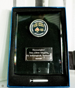 Es war ein ereignisreicher Tag, der um 15:30 Uhr in unserem Vereinsheim startete. Nach einer kurzen Begrüßung durch unseren 1. Vorsitzenden Thilo übergab dieser das Mikro an Potti, denn es stand eine besondere Ehrung auf dem Programm. Auf unserer letzten Mitgliederversammlung Anfang März beschlossen wir, Sven die Ehrenmitgliedschaft zu verleihen. Für seine besonderen Verdienste für den Verein in den Anfangsjahren wurde er nun ausgezeichnet. Er besitzt nach seinem Austritt Ende 2018 nun wieder alle Rechte eines regulären Vereinsmitglieds und durfte somit auch an den Vereinsmeisterschaften teilnehmen. Wir freuen uns auf weitere Teilnahmen, lieber Sven!