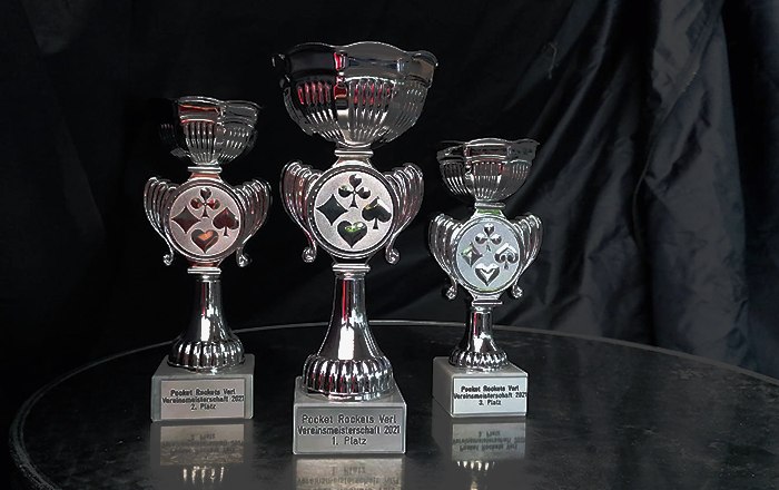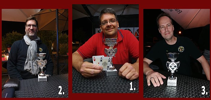 Die Vereinsmeisterschaften `21 standen unter dem Motto „Endlich wieder Live-Poker“. Wir haben uns sehr gefreut, mal wieder zusammen spielen zu können. Das große Wiedersehen fand unter freiem Himmel statt. Gastgeberin Ada hatte uns perfekte Bedingungen geschaffen, so dass uns auch 2 kurze Schauer nicht viel anhaben konnten. 19 Anmeldungen gab es im Vorfeld, dann aber leider eine kurzfristige Absage von Doppelvereinsmeister Dirk. So gingen 18 Spieler an 3 Tischen an den Start. Pünktlich um 16:00 Uhr wurden die ersten Hände gedealt. Wie bei den Vereinsmeisterschaften üblich gab es reichlich Chips. So konnten alle Spieler erstmal entspannt und ohne großen Druck starten. Dennoch gab es einen frühen ersten Bustout. Nach nur 90 Minuten musste Alex leider schon die Segel streichen. Nach einer 3-Bet auf gut 3.000 wurde er von Jens F. mit 16.000 Chips All-In gestellt. Alex callte mit seinen restlichen 9.000 Chips mit der besten Starthand (AA), aber gleichzeitig auch mit einem schlechten Gefühl. Jens drehte Pocket 10er um und ein direkter 10er Treffer am Flop wurde Alex dann zum Verhängnis. 3 Stunden / 9 Level wurden bis zum Dinnerbreak gespielt. Mit Marcus, Salvatore, Günter und Mario mussten weitere 4 Spieler bis dahin an die Rail. In der Pause gab es aber lecker Essen für alle und es blieb auch Zeit für einen netten Smalltalk. ![]() Nach dem mit Potti der Meister von 2018 ausschied wurde der erste Tisch aufgelöst und an 2 Tischen mit je 6 Spielern fortgesetzt. Eine der spektakulärsten Hände gab es als gleich 3 Spieler Preflop all ihre Chips in die Mitte brachten. Thilo und Thorsten drehten beide Pocket AA um und Andreas zeigte Pocket JJ. Hilfe gab es für ihn leider keine und da er short war, konnten sich Thilo und Thorsten die Chips teilen. Kurz nach 21:00 Uhr stand dann der Finaltisch fest. 7 Spieler traten zum großen Showdown an. Mit dabei waren in folgende Sitzfolge Ingo, Thilo, Jens C., Burkhard, Thorsten, Jens F. und Karen. Thilo und Thorsten starteten mit den größten Stacks, aber so richtig Short war zu diesem Zeitpunkt noch keiner der anderen Spieler. ![]() Jens F. musste als erster seinen Traum von einem Platz auf dem Podium begraben. Und auch für Ingo, der sich im weiteren Verlauf als Smallstack lange wehren konnte, ging es auf Platz 6 zu Ende. Thorsten hatte den ganzen Abend über eine aufregende Berg- und Talfahrt. In den ersten Stunden war er sehr aggressiv unterwegs und konnte schnell viele Chips anhäufen, dann gab es 1 bis 2 unglückliche Situationen und danach wieder einen steilen Weg nach oben. Am Ende wurde es für ihn der fünfte Platz. Karen konnte sich mit einem unauffälligen aber stets soliden Spiel bis in die Bubble-Phase um die 3 Podestränge vorarbeiten. Am Final Table hatte sie aber kaum Kartenglück und verpasste nach 2 zweiten Plätzen (2020 und 2018) einen Pokal dieses Mal nur um Haaresbreite. Der Kampf um die Krone ging dann mit relativ ausgeglichenen Chipständen in die Entscheidung. Mit dabei Jens C., der bis dahin aktuelle Champion von 2020. Neben ihm saß Burkhard, Champion von 2019. Und mit dabei Thilo, Champion von 2015. Thilo hatte im Verlaufe des Turniers schon 2 kribbelige Situationen überstanden. In einer All-In-Konfrontation mit Jens F. stand sein Turniergeschehen ebenso auf der Kippe (10BB All-in, Sieg gegen AA), wie auch gegen Ole, als er sich mit AQ gegen AK noch eine Straße zusammen basteln konnte. Für Burkhard verlief das Turnier eher unspektakulär. Nie richtig short, aber auch nie weit vorne. Für ihn gab es den wichtigsten Showdown gegen Thorsten. Burkhard pushte schon zuvor mehrfach vom Button All-In, bis sich Thorsten dann mit einer guten Hand zur Wehr gesetzte. Burkhard ging mit AT vom Button All-in, Thorsten zeigte KQ. Thorsten konnte sich aber nicht verbessern und Burkhard gewann einen 150K Pot und konnte erstmal die Spitze übernehmen. Für Jens stand das Turnier einmal auf wackeligen Beinen. Am Final Table entschloss er sich zu einem All-In bei dem aber klar war, dass Big Stack Thorsten (der schon Chips im Pot hatte) seine Hand nicht mehr folden würde. ATs erwies sich aber als gut genug und war gegen Thorstens Hand im Vorteil. Bei einer weiteren All-In Konfrontation gegen Karen war er mit AA zwar gegen Karens 77 klarer Favorit, aber auch so eine Hand muss den Showdown erst einmal überstehen. An Spannung hat es dann auch nicht gemangelt. Lange Zeit war die Chipverteilung sehr ausgeglichen, irgendwann hatte Burkhard 50 Prozent der Chips und Thilo / Jens lagen gleichauf. Aber im Wissen, das jeder Fehler die Situation komplett ändern könnte, ging es lange hin und her. Der Showdown um Bronze fiel dann in einem Duell Thilo gegen Jens, in dem Jens das Glück auf seine Seite zog, Thilo wurde dennoch ein zufriedener Dritter. Auch im Heads Up war alles offen. Im Vorfeld dachten wir, dass das Turnier gegen 22 Uhr zu Ende gehen würde, letztendlich ging es doch bis kurz vor 23 Uhr. In der letzten Hand kam es zu einem Showdown mit einer Hand, die auch im ersten Bustout des Tages gezeigt wurde und unserem Vereinsnamen alle Ehre bereitet. Die Pocket Rockets waren am Start… Burkhard limpt mit der bestmöglichen Starthand und Jens stellt alles rein. K4 von Jens konnte sich auf einem gepairten Board nicht verbessern und da Burkhard einen kleinen Chipsvorsprung auf seiner Seite hatte, gingen die Vereinsmeisterschaften mit dieser Hand zu Ende. ![]() Burkhard gewinnt seinen zweiten Titel, Jens steht nach seinem Vorjahressieg erneut auf dem Treppchen und auch Thilo darf sich über einen Pokal und einen weiteren Eintrag in die Hall of Fame freuen. Wir gratulieren allen ganz herzlich!! Wir freuen uns sehr, dass wir uns wieder live treffen konnten, uns Ada nach auch langer Pause eine perfekte Location zur Verfügung stellen konnte, wir lecker gegessen haben und auch sonst alles prima war. Wir hoffen, dass wir wieder ein wenig Routine rein bekommen und weitere Turniere möglich sein werden!! Das vollständige Ergebnis gibt es hier!!